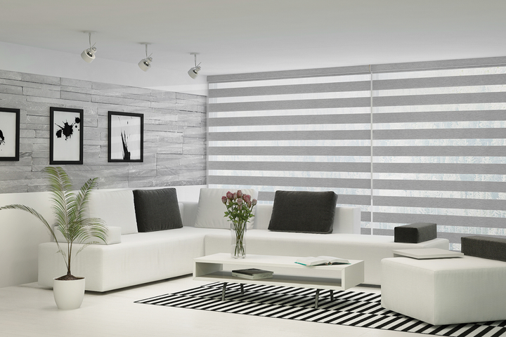 Featuring luxury brand Neolux fabrics. Banded roller shades, or “Zebra” shades offer light filtering and privacy with overlapping sheer and transparent fabric bands.