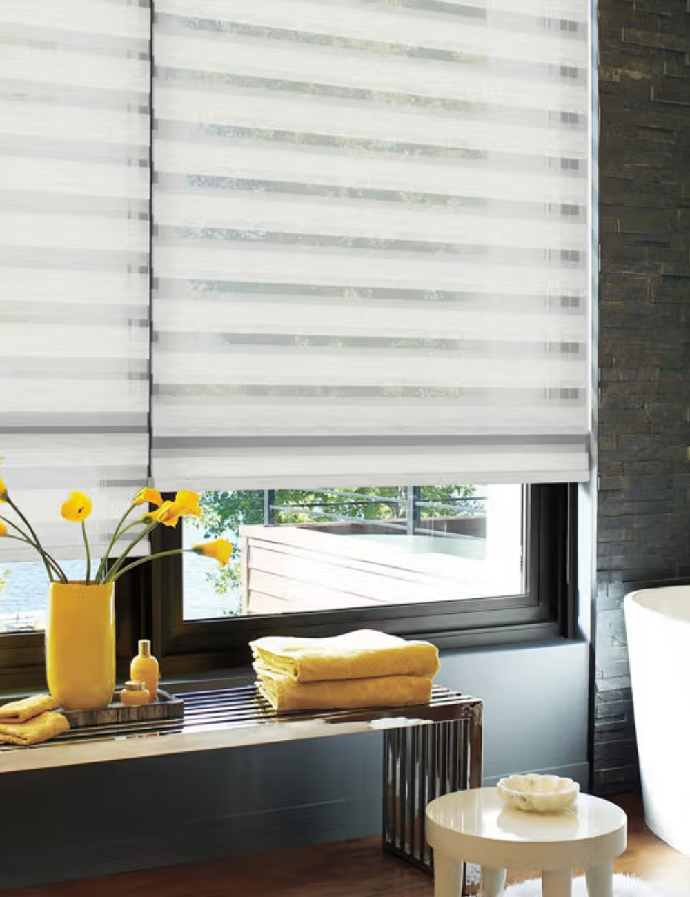 Banded zebra shades are a contemporary alternative for a simple and modern designer finish. Create dramatic visual effects and precise light filtering with our modern banded shades. Alternating bands of sheer and opaque fabric offer unparalleled control, allowing clients to transition from clear views to complete privacy with a simple adjustment. Overlapping sheer/solid bands with precision and same-roll sourcing ensure consistent alignment and a clean, high-end appearance for a whole-space solution.